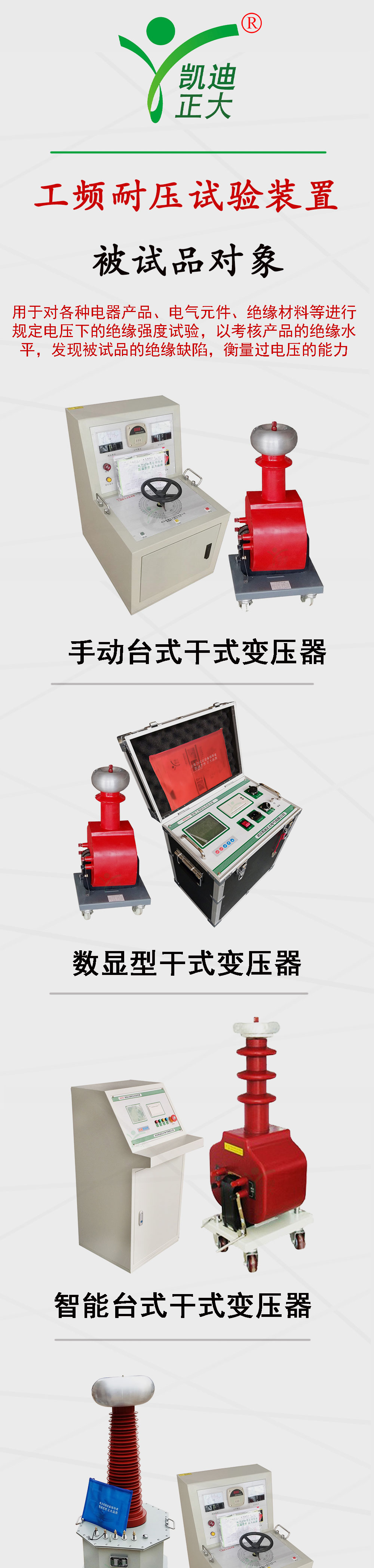 2.   KDGTB工頻耐壓試驗裝置是根據國家新的電力行業(yè)標準而設計的、性能新的的耐壓試驗設備,用于對各種電器產品、電氣元件、絕緣材料等進行規(guī)定電壓下的絕緣強度試驗,以考核產品的絕緣水平,發(fā)現(xiàn)被試品的絕緣缺陷,衡量過電壓的能力。