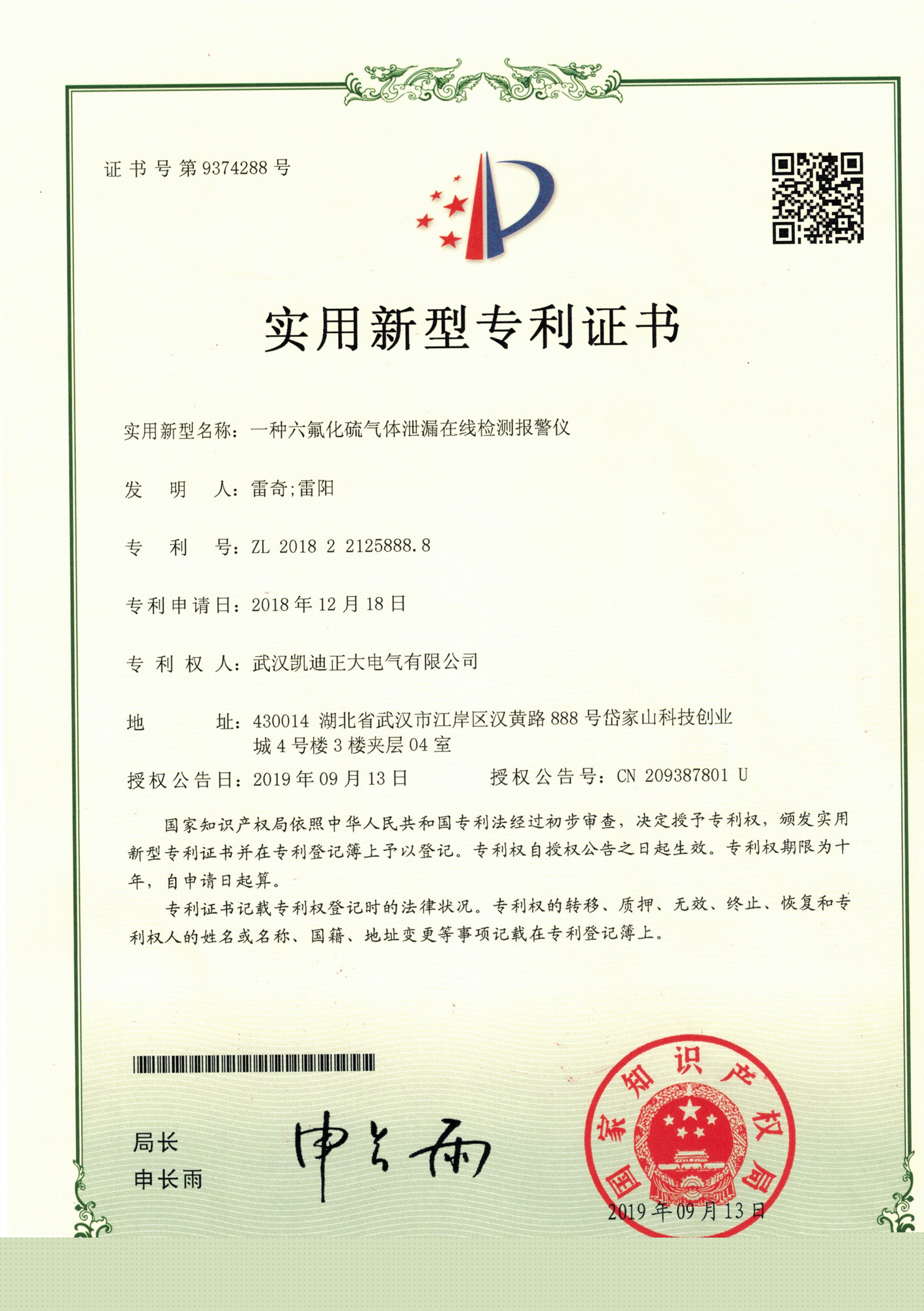 “KDXJ-8六氟化硫氣體泄漏報警系統(tǒng)”曾獲實用新型專利證書