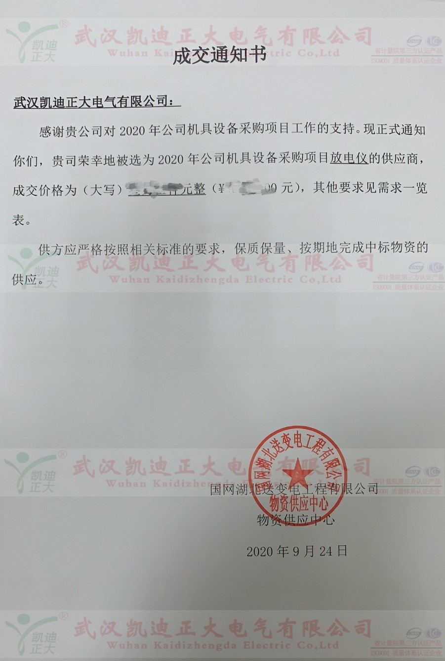 祝賀獲得國網(wǎng)湖北送變電公司蓄電池放電儀成交通知書