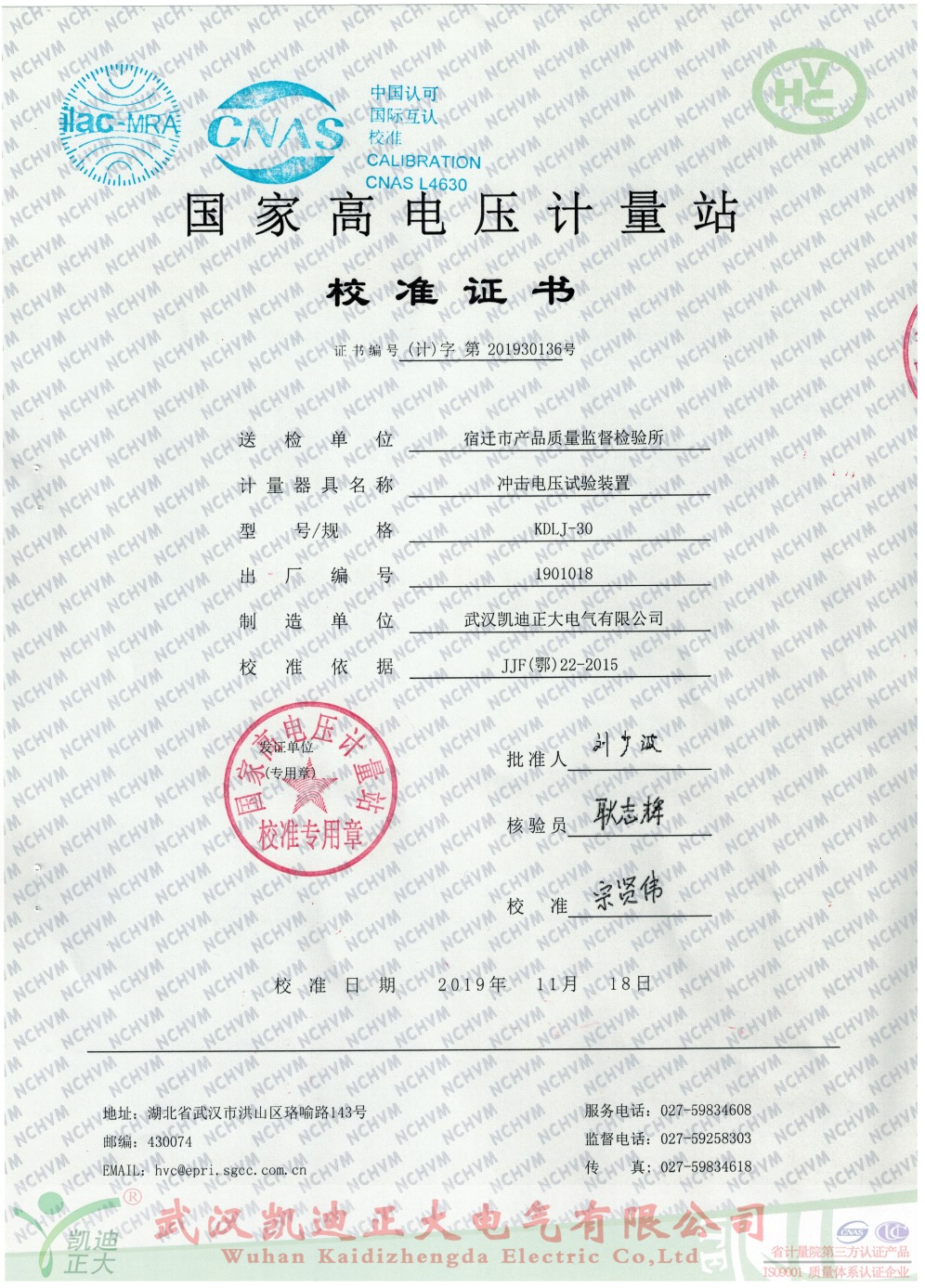 武漢市計量測試檢定(研究)所對宿遷市產品質量監督檢驗所采購的產品作檢定效驗報告。