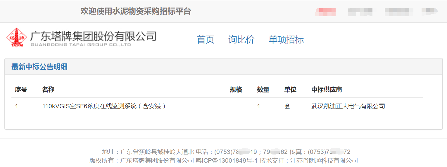 中標廣東塔牌集團SF6濃度在線監測系統