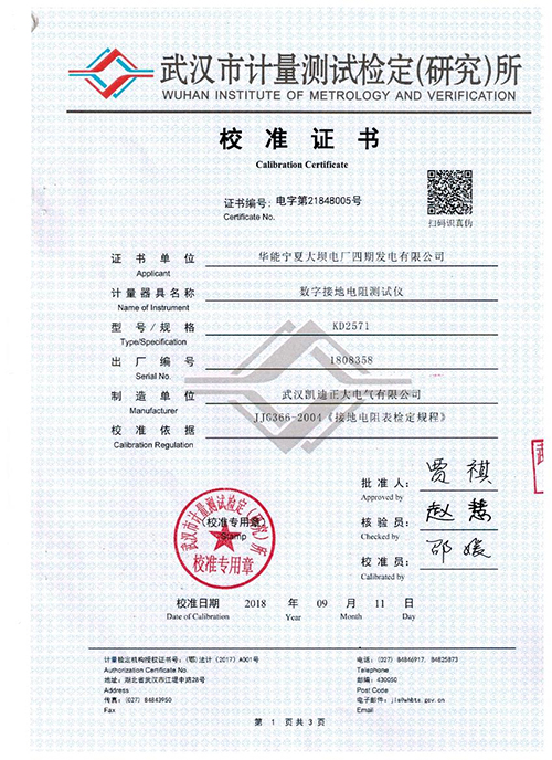 武漢凱迪正大KD2571數字接地電阻測試儀校準證書