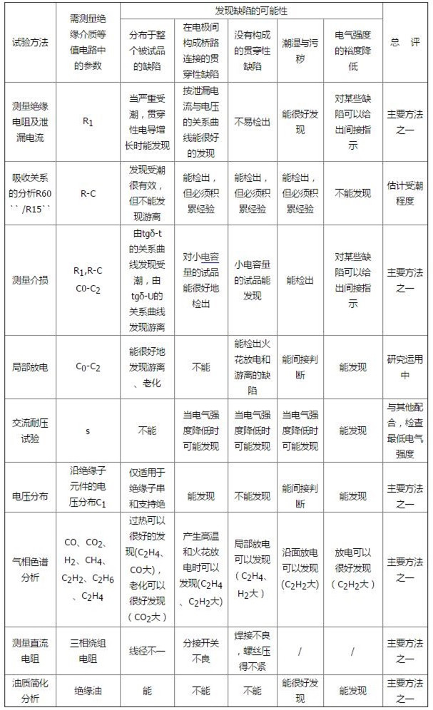 從表中可見,每種試驗(yàn)方法都只能發(fā)現(xiàn)某一方面的絕緣缺陷,因此,單靠一種試驗(yàn)方法,有時(shí)很難判斷絕緣好壞,須根據(jù)各種試驗(yàn)方法的特點(diǎn)和試驗(yàn)結(jié)果,相互比較與補(bǔ)充,力求作出準(zhǔn)確的判斷。這就要求我們?cè)趯?shí)際工作中,掌握各種試驗(yàn)方法,注意提高綜合試驗(yàn)分析的能力。