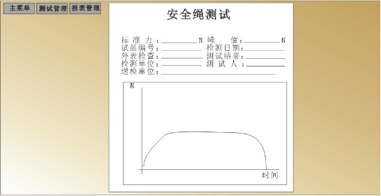 參數設置。這里要特別查看(當前狀態(tài)顯示)的內容,確認是否是自動模式,傳感器是否符合試驗的量程,還有是否是拉力測試,確認無誤后再做下面的事情;清零按鈕用于清除初始值。然后點擊確認測試按鈕開始測試,但系統(tǒng)力值到達設定值的20%時,系統(tǒng)會自動停止,此過程為預緊過程,若此過程有出現較大的變動,可能由于夾具沒夾緊,此時試驗人員可根據具體的現象進行檢查,若沒有問題試驗人員用鼠標點擊繼續(xù)測試,設備繼續(xù)加載力值,測試數據欄中會顯示當前狀態(tài)的受力情況,當拉力力值達到設置的力值時,開始自動計時,設備開始保持力,力值不過沖。同時右邊的實時曲線將記錄實時力值與時間的曲線。計時完成后設備自動卸載力,關閉電磁閥,關閉油泵,測試結束。鼠標點擊進入報表按鈕進入報表界面。