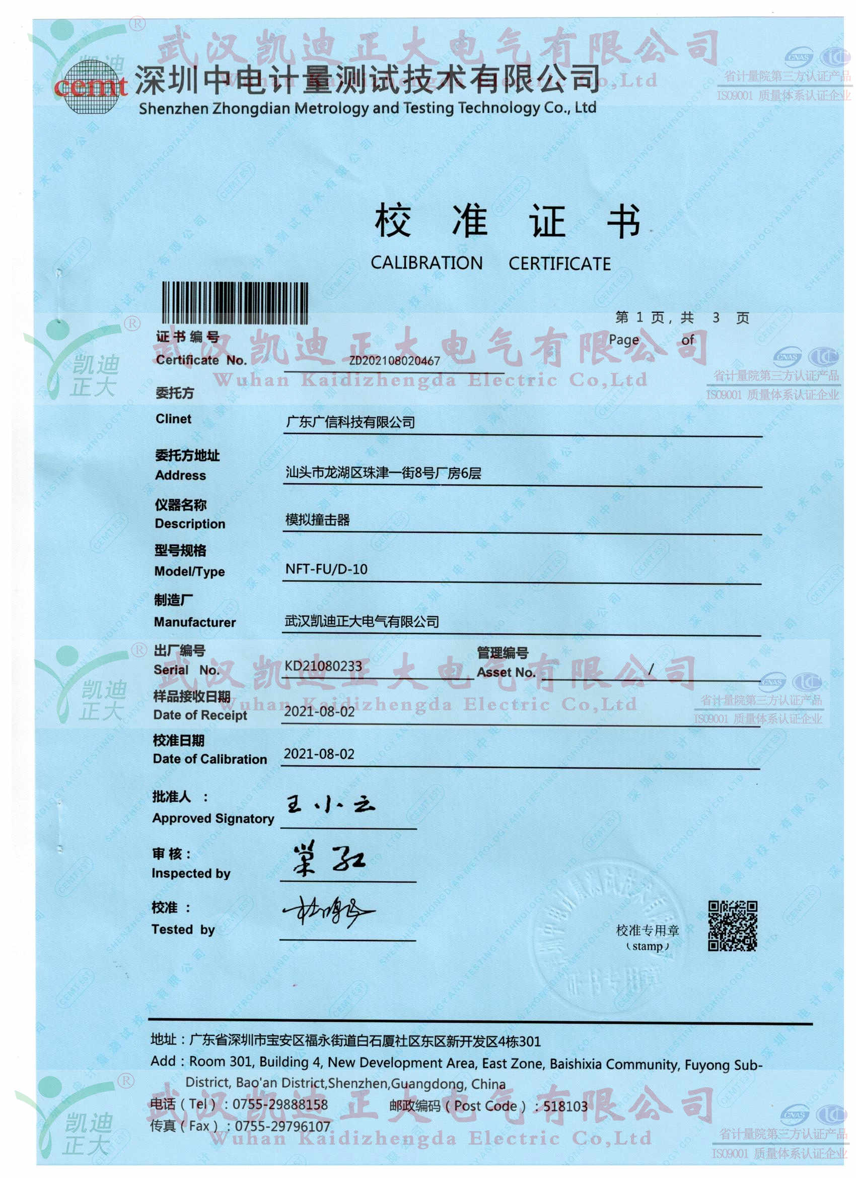 隨著汕頭市廣信電氣設備有限公司的業務增加、產品形象定位精準得到市場的認可,更名廣東廣信科技有限公司。一直堅持“誠實, 守信”的經營理念,采購國內著名品牌產品用于生產成套設備,高效率的檢測設備。這次采購的NFT-FUD-10交流高壓負荷開關模擬撞擊器用于熔斷器撞擊器動作試驗。NFT-FUD-10獲得中良計量模擬裝擊器校檢報告。