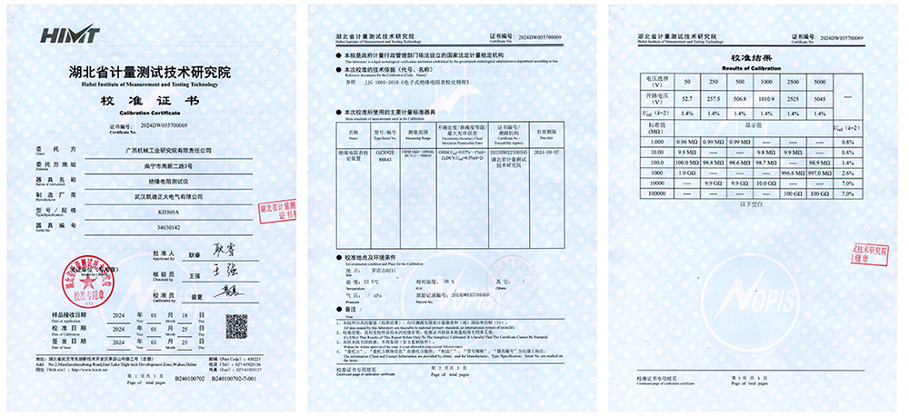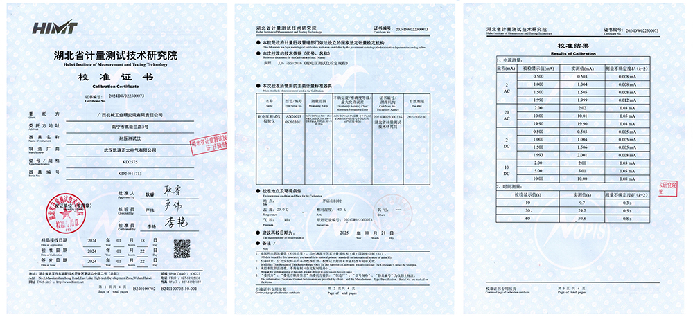 2024年1月25日,廣西機械工業(yè)研究院有限責(zé)任公司成功采購了凱迪正大電氣的KD305A 絕緣電阻測試儀、KD2575 耐壓測試儀、KD2678 30A接地電阻測試儀、KDGK-F 開關(guān)特性測試儀等電力儀器儀表,均通過權(quán)威的湖北省計量測試技術(shù)研究院的嚴(yán)格校準(zhǔn)。