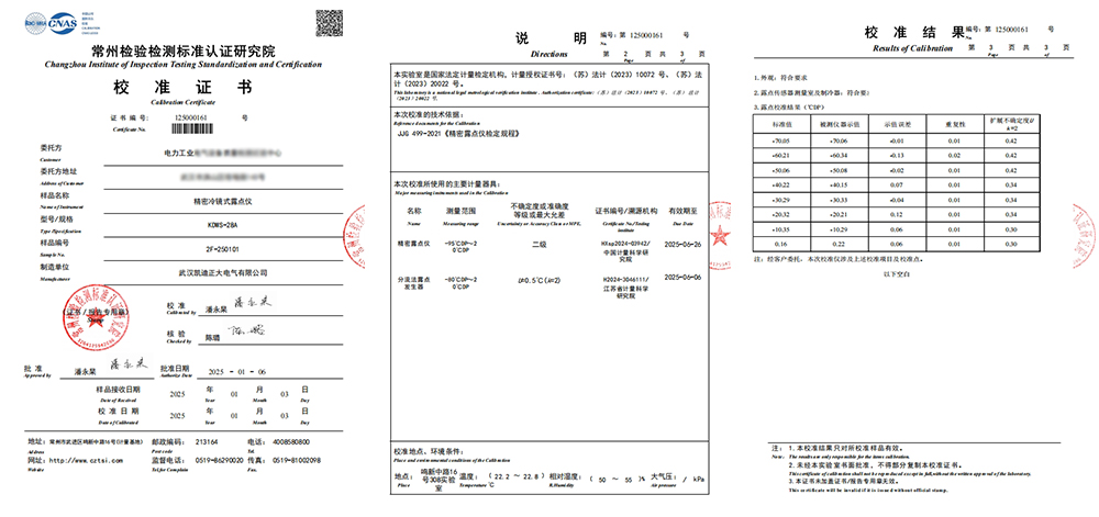 2025年1月3日,武漢凱迪正大電氣有限公司的KDWS-28A精密冷鏡式露點儀,成功通過了常州檢驗檢測標準認證研究院的嚴格校準,并榮獲校準證書,標志著該產(chǎn)品在工業(yè)氣體微水測量的可靠和精準性。