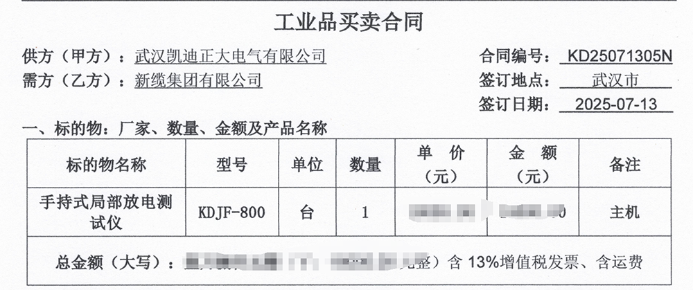 2025年7月13日,電力設(shè)備制造商新纜集團(tuán)有限公司采購了武漢凱迪正大電氣有限公司的KDJF-800局部放電檢測(cè)儀,這彰顯了武漢凱迪正大在局部放電檢測(cè)領(lǐng)域的專業(yè)實(shí)力和市場(chǎng)地位。