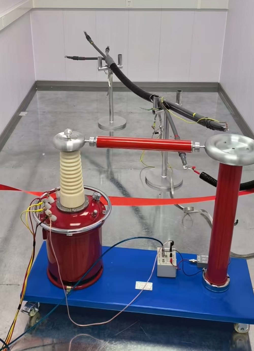 屏蔽室內(nèi)尺寸為長(zhǎng)5米×寬4米×高2.45米,配置了電動(dòng)平移屏蔽門和手動(dòng)單開屏蔽門,方便人員和設(shè)備進(jìn)出。室內(nèi)還安裝了通風(fēng)截止波導(dǎo)窗和電源濾波器等設(shè)備,有效隔離了外部電磁干擾和電源干擾。同時(shí),屏蔽室內(nèi)還配置了無電磁干擾的LED長(zhǎng)管燈和接地系統(tǒng)等設(shè)施,為局部放電試驗(yàn)提供了一個(gè)安全、舒適、可靠的測(cè)試環(huán)境。