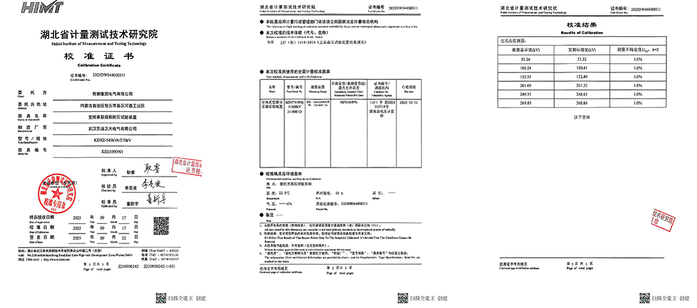 本次校準(zhǔn)由湖北省計(jì)量測試技術(shù)研究院執(zhí)行,該校是政府依法設(shè)立的法定計(jì)量檢定機(jī)構(gòu),具備國家認(rèn)可的校準(zhǔn)資質(zhì)與溯源能力。校準(zhǔn)過程嚴(yán)格依據(jù)JJF(浙)1144-2018《交流高壓試驗(yàn)裝置校準(zhǔn)規(guī)范》進(jìn)行,確保了技術(shù)方法的規(guī)范性與結(jié)果的可比性。