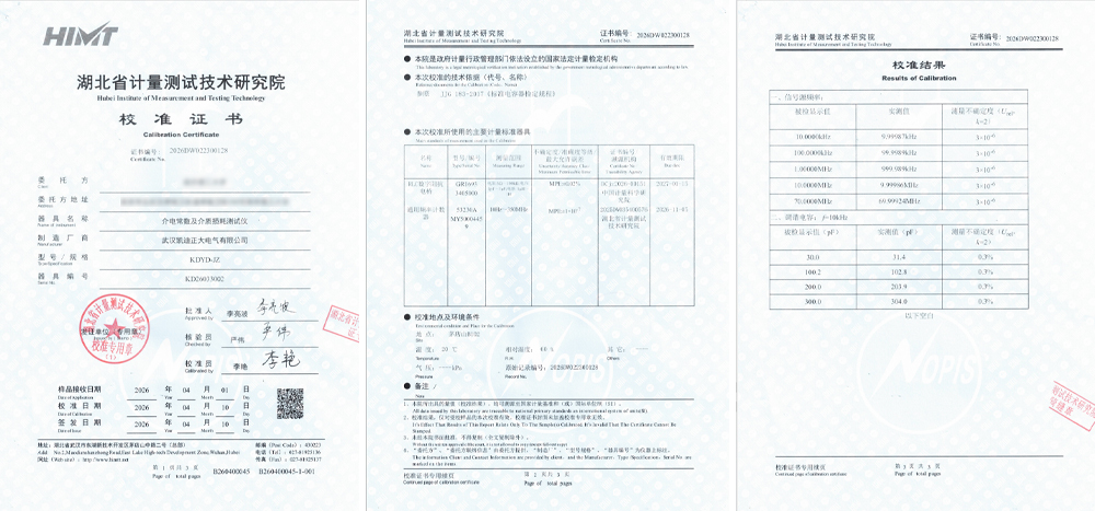 數據準確是檢測儀器的生命線。為確保量值統一、結果可靠,KDYD-JZ 介電常數及介質損耗測試儀已通過湖北省計量測試技術研究院嚴格校準,證書編號:2026DW022300128。本次校準依據 JJG183-2017《標準電容器檢定規程》實施,采用中國計量科學研究院溯源的 RLC 數字阻抗電橋與高精度頻率計數器作為標準器具,環境溫度 20℃、相對濕度 60%,校準條件規范可控。校準結果顯示,儀器在 10.0000kHz 至 70.0000MHz 頻率點顯示值與實測值高度吻合,相對不確定度達 3×10??(k=2);調諧電容各點誤差≤0.3%,關鍵指標均滿足技術要求,量值可直接溯源至國家計量基準與國際單位制(SI),校準結果僅對本次送檢樣品有效,具備官方效力與法律效力。